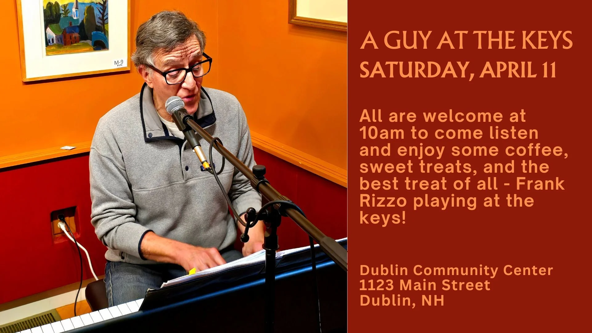 All are welcome at 10 am to come listen and enjoy some coffee, sweet treats, and the best treat of all – Frank Rizzo improvising on the keys!