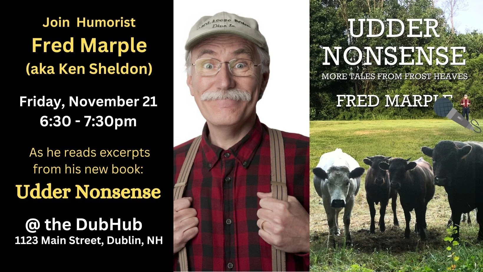 Join us at 6:30 pm for this treat that will tickle your funny bone! Yankee humorist Fred Marple (aka Ken Sheldon) will read from his new book, Udder Nonsense: More Tales from Frost Heaves. The Loon Lodge's fundraiser goes awry thanks to a flock of uncooperative ducks. Young Albert Cooper’s plans for romance are thwarted by a prize pig. Millard Tuttle rescues Santa Claus and a bingo champ meets her match. Fred Marple has been called “the voice of New Hampshire as Bert & I once were to Maniacs." Fred's humor columns have been in Yankee Magazine, New Hampshire Magazine, and other publications. He has appeared on New Hampshire Chronicle, on the radio, at town halls, church basements, and the homes of most of his friends, usually right around dinner time.